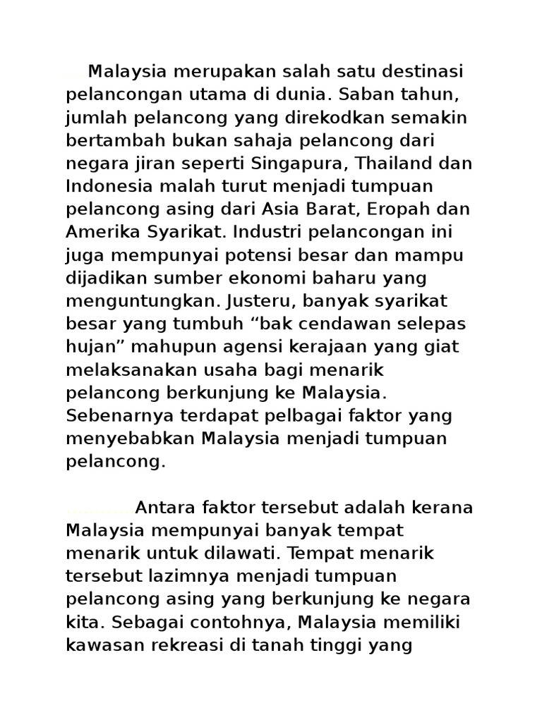 Semoga dengan perkongsian ini sedikit sebanyak dapat membantu anda dalam menghasilkan karangan yang berkualiti. Sehingga kini sektor pelancongan merupakan sektor kelima terbesar negara selepas sektor perkhidmatan kewangan kelapa sawit borong dan runcit gas dan tenaga dan petroleum dengan menyumbang sebanyak RM369 bilion kepada Keluaran Negara Kasar KNK. Industri Pelancongan di Malaysia telah dikenalpasti sebagai pendorong utama di dalam sektor perkhidmatan.